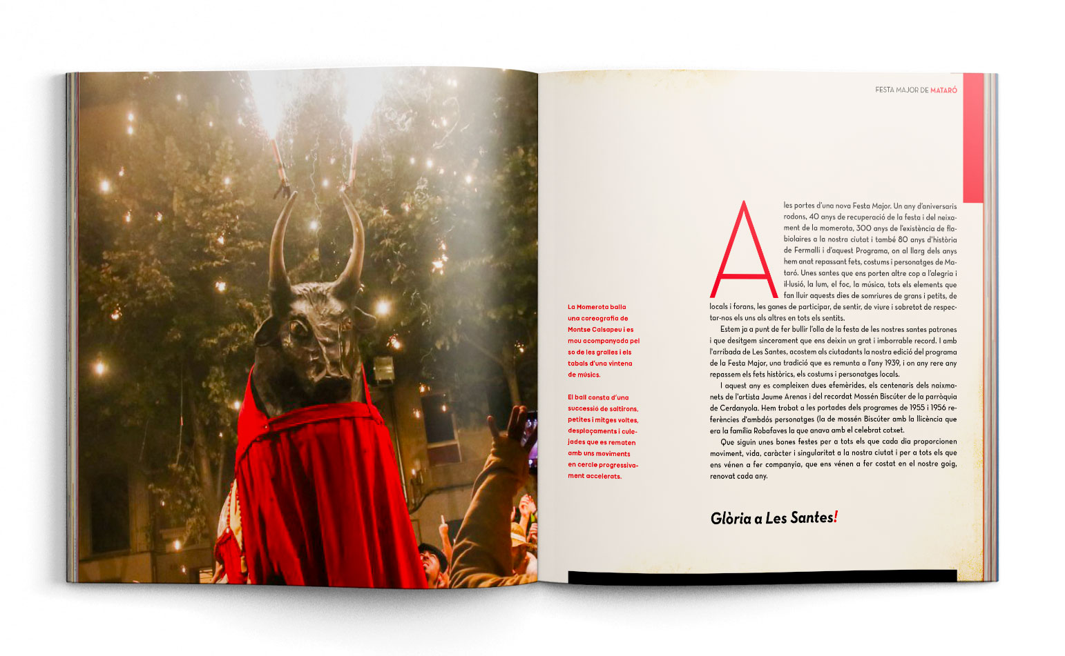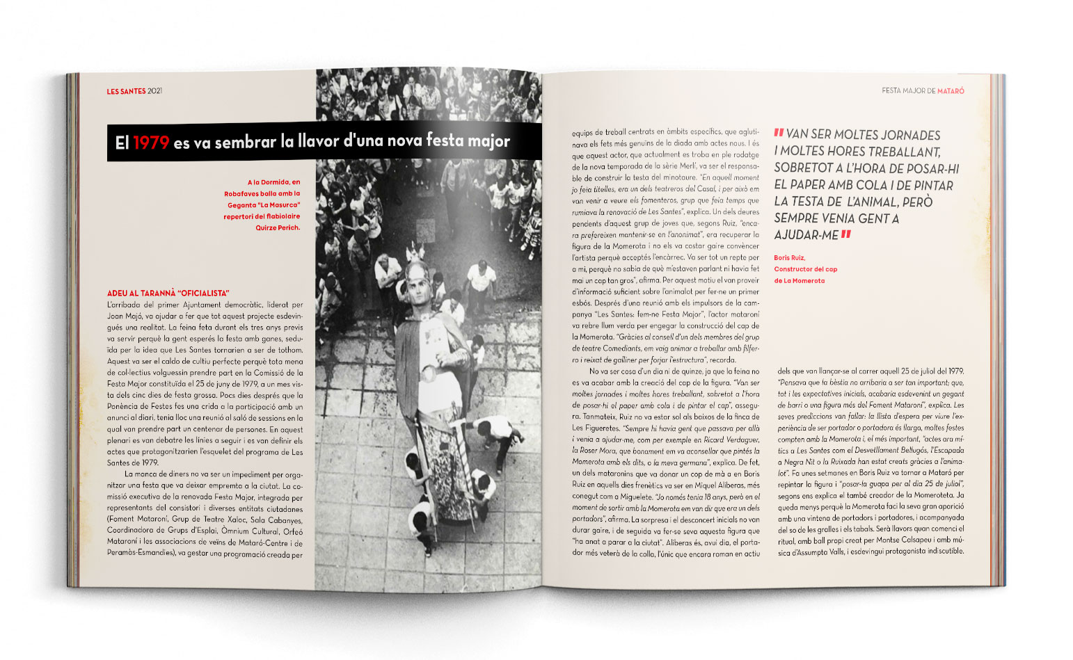 Illustrations for the cover and interior layout of the Les Santes festival program, produced by the advertising agency Fermalli, feature a geometric and caricatured style. Each edition highlights one of the city's comparsas, showcasing the 'capgrossos' or 'gegants' that are integral to the celebration, capturing the vibrant spirit of Mataró’s main festival.¶